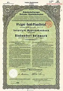 Mit der Gründung der Aktiengesellschaft Leipziger Hypothekenbank 1863 wurden die Bedingungen für die Aufnahme eines Kredits auf Grundbesitz gelockert. Jedweder Grundbesitz in Sachsen und auch darüber hinaus konnte verpfändet werden. Sitz der Bank war Leipzig. Zu ihren Gründern gehörte der Philosophiedozent Oswald Marbach. Von 1896 bis 1901 war ihr Direktor der spätere Leipziger Oberbürgermeister Karl Rothe, welcher zu späterer Zeit noch im Aufsichtsrat der Bank tätig war. (Unterschrift im abgebildeten Gold-Pfandbrief)