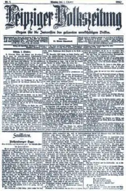 Direkt nachdem die Redaktionsgeschäfte in Schönlanks Hand lagen, registrierte die Polizei die geschickte Leitung der Zeitung, die zwar eine ungemein scharfe und aufreizende Sprache führe, allerdings so geschickt und vorsichtig gehalten sei, dass eine gerichtliche Verfolgung bis auf eine Ausnahme nicht möglich sei.[7] Nach dem frühen Tod Schönlanks im Oktober 1901 übernahmen zunächst Wilhelm Blos und Franz Mehring die Leitung der LVZ. Am 1. April 1902 trat Rosa Luxemburg in die Redaktion der Zeitung ein. Doch nur drei Monate später verließ sie diese wieder, da sie sich mit den Mitarbeitern überwarf. Hierauf wurde Mehring alleiniger Chefredakteur. Diesen Posten führte er bis zu seinem Rücktritt im Jahr 1907 aus. Auf Mehring folgte Paul Lensch, der seit 1902 bei der LVZ beschäftigt war, und nach dessen Entlassung im Jahr 1913 übernahm Hans Bloch die Chefredaktion.[8] In dieser Zeit war die LVZ (1914 mit einer Auflage von 53.000) das wichtigste Sprachrohr des linken SPD-Flügels um Rosa Luxemburg. 1917, nach der Spaltung der SPD, ging die Zeitung in den Besitz der USPD über und erschien nach deren Wiedervereinigung mit der SPD 1922 bis zum Verbot 1933 erneut als SPD-Organ.[9]