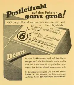 In den 1950er Jahren hielten sich immer weniger Briefschreiber an die Postleitzahlen. Nur noch jede dritte Sendung hatte die Postgebietsleitzahl in der Anschrift. Dies führte sogar dazu, dass im Bereich der Bundespost Anfang der 1950er Jahre Überlegungen stattfanden, auf Postleitzahlen komplett zu verzichten.[12] Mitte der 1950er Jahre hatte sich die Situation durch die bevorstehende Automation des Briefverteildienstes jedoch überholt und es wurde über ein neues System nachgedacht.[13]