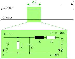 Die Telegrafengleichungen lassen sich aus den elementaren Gesetzen der Elektrotechnik, nämlich der Knoten- und der Maschenregel, herleiten, wenn man sich die gesamte Leitung aus kleineren Einheiten der Länge mit einer inneren Schaltungsstruktur aufgebaut denkt. Da die Herleitung aus mathematischer Sicht allerdings nicht als streng zu bezeichnen ist, ist dieser Abschnitt mit „Motivation der Gleichung“ und nicht mit „Herleitung“ überschrieben. Der „innere“ Aufbau eines solchen Leitungssegmentes ist in Abbildung 1 dargestellt: Die Kapazität des Leitungsstücks wird durch einen Kondensator der Kapazität zusammengefasst, sein ohmscher Widerstand in einem einzelnen ohmschen Bauelement mit dem Widerstandswert , seine Induktivität entsprechend mit einer Spule der Selbstinduktivität . Querleitverluste werden durch einen Querwiderstand zwischen den beiden Adern modelliert. Dieser ohmsche Widerstand mit (meist sehr geringem) Leitwert steht für den Isolator, der die Adern der Leitung voneinander trennt. Wendet man die Maschenregel auf diejenige Masche an, die nur die Spannung , die Spule, den ohmschen Widerstand und die Spannung enthält, so erhalten wir unter Beachtung der Vorzeichen: