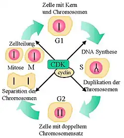 Der in der Abbildung skizzierte Ablauf der Zellteilung gliedert sich in die vier Hauptphasen G1 = Wachstum der Zelle, S = Synthese der DNA, G2 = Duplikation der DNA und M = Mitose oder Teilung in getrennte Zellen. Hartwell gelang es, die für die zeitlich koordinierten Abläufe zuständigen über 100 CDC-Gene zu identifizieren. Eines davon, CDC-28, ist für den Start der Zellteilung zuständig. Die Steuerung erfolgt über diverse CDK-Moleküle (CDK = cyclin dependent kinase) und Cycline, für deren Entdeckung die beiden anderen Physiologie oder Medizin-Nobelpreisträger des Jahres 2001 geehrt wurden.