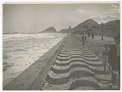Die gepflasterte Strandpromenade, genannt Calçadão, entstand bis 1919 beim Bau der Avenida Atlântica (1906) im Stil eines europäischen Strandboulevards durch portugiesische Ingenieure. Nach dem Vorbild der Calçada Portuguesa auf dem Rossio in Lissabon entwarfen sie ein sich symbolisch auf das Meer beziehendes Wellenmuster aus weißem Kalkstein und schwarzem Basalt. Nach einer Ufervorschiebung („alargamento“) Ende der 1960er Jahre, die nach einem technischen Plan von Hildebrando de Araujo Góes Filho († 2021) die Entwässerung und den Hochwasserschutz verbesserte sowie Raum für einen breiteren Strand und eine Verbreiterung des Straßenprofils der Avenida Atlântica schuf, modernisierte der Landschaftsarchitekt Roberto Burle Marx Anfang der 1970er Jahre den neuen Stadtraum einschließlich der Promenade nach einem einheitlichen Entwurf. Seiner Komposition wurden 1985 die signifikanten Kokospalmenhaine hinzugefügt. Das beibehaltene Wellenmuster – nunmehr längs verlegt – avancierte zu einer Medienikone und zu einer Marke Rio de Janeiros. Es ist als Symbol auf vielen Produkten zu sehen, bildet ein immer wieder auftauchendes Erkennungszeichen im touristischen Marketing und repräsentiert die Corporate Identity der Stadt und ihrer Einwohner, der Cariocas.[20] 1991 wurde der Calçadão von dem Instituto Estadual do Patrimônio Cultural zum Kulturerbe erklärt.[21]