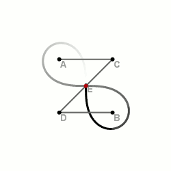 - Der Mittelpunkt zwischen und ist ein Doppelpunkt der Kurve, er wird also zweimal durchlaufen. Er ist kein Berührungspunkt, sondern ein Schnittpunkt. Die beiden Tangenten in ihm schneiden die Verbindungsgerade von und in einem Winkel von 45°.