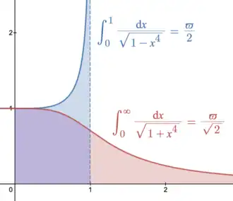 {\displaystyle \int _{0}^{1}{\frac {1}{\sqrt {x^{4}+1}}}\,\mathrm {d} x={\frac {\varpi }{2{\sqrt {2}}}}}