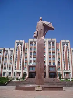 - Comrat, Hauptstadt der Gagausen in Moldawien. Das steinerne Lenin-Denkmal steht vor dem Regierungssitz, einem modernen Beton-Stahl-Bau.[62]