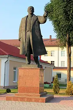 - Hrodna: Leninplatz, fünf Meter hohe Bronzeskulptur auf mit roten Natursteinplatten verkleidetem Postament, 1987, Bildhauer: Sair Asgur[23], Architekt: W. Aladow[24] (Fotos siehe hier) – in der Stadt gab es mindestens vier weitere Lenindenkmäler (eine Statue, 1940 zerstört, zwei Statuen mit jeweils erhobenem Arm auf Sockel sowie eine Sitzgruppe mit Stalin)[25]