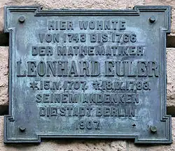 Euler lebte insgesamt 25 Jahre lang in Berlin, wo er über 380 Artikel schrieb. In Berlin veröffentlichte er zwei seiner bekanntesten Werke: die Introductio in analysin infinitorum, ein 1748 veröffentlichter Text über Funktionen, und die Arbeit Institutiones calculi differentialis,[44] die die Differentialrechnung behandelt und 1755 veröffentlicht wurde. 1755 wurde er zum ausländischen Mitglied der Königlich-Schwedischen Akademie der Wissenschaften gewählt.