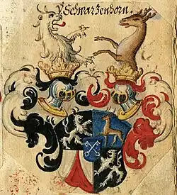 - Blasonierung des vermehrten Wappens von 1581: Geviert. Felder 1 und 4 in Schwarz ein nach innen gekehrter silberner Löwe, Feld 2 in Blau ein natürlicher Rehbock, Feld 3 in Silber eine eingeschweifte rote Spitze. Zwei gekrönte Helme: I. mit schwarz-silbernen Helmdecken der silberne Löwe wachsend, II. mit rot-silbernen Decken der Rehbock wachsend.