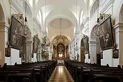 1669/70 wurden die Juden von Leopold I. auf Drängen seiner spanischen Gattin und des Wiener Magistrats auch hier vertrieben, wobei viele von ihnen im Gebiet des heutigen Burgenlandes Aufnahme fanden, wo unter dem Schutz der ungarischen Magnatenfamilie Esterházy die Siebengemeinden entstanden.[14] 1670 legte der Kaiser den Grundstein für eine 1671 dem Heiligen Leopold geweihte Kirche, nachdem an der Stelle die erst ein paar Jahre vorher errichtete Synagoge von den Wienern niedergebrannt wurde.[15] Seit dieser Zeit wird der Untere Werd nach dem Kaiser Leopoldstadt genannt, ein Name, der 1850 von diesem relativ kleinen Gebiet auf den ganzen Bezirk überging. 1679 herrschte eine verheerende Pestepidemie.[16] 1683 wurde die Leopoldstadt bei der Zweiten Wiener Türkenbelagerung von den Belagerern verwüstet und in den folgenden Jahren wieder aufgebaut. 1722 bis 1724 wurde die Leopoldskirche nach Plänen von Anton Ospel neu errichtet.