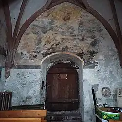 Im ersten nördlichen Joch befinden sich Schriftfragmente mit der Angabe 1447. An der südlichen Chorwand gibt es eine Rötelzeichnung hl. Wolfgang aus dem 15. Jahrhundert und den Schriftzug Godfredus. In den Zwickelfeldern des Rippengewölbes im Norden und Süden sowie in der Westwand befindet sich eine Malerei aus der zweiten Hälfte des 17. Jahrhunderts, sie zeigen Jüngstes Gericht, Taufe Christi. Die vier Darstellungen Jonas-Szene, Schiffbruch des Paulus, Sturm auf dem See Genezareth und Christus wandelt auf dem Wasser orientieren sich an Vorbilder in der Matthäus-Merian-Bibel von 1625/1627. Weiters die Darstellung Kreuzannagelung Christi, und am unteren Rand der Szenen Stifterfiguren, im südlichen Chorjoch Christoph Pernegger und weitere Inschriftfragmente. Die Netzrippen waren weiß mit schwarzer Ornamentierung bemalt, davon ist ein Fragment an den nördlichen Chorrippen erhalten.