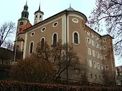 Der rechteckige Kirchenbau mit einer Rundapsis, baulich verbunden mit dem Leprosenhaus, hat eine mit Ecklisenen eingefasste Fassade und ein mit einem Gesims abgesetztes Schopfwalmdach und trägt einen Dachreiter. Die Fenster haben einen eingezogenen Rundbogenabschluss und darüber Ovalfenster.