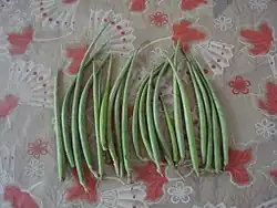 Die schmalen und kahlen, vielsamigen, grünen, gartenbohnenförmigen Früchte, Balgfrüchte sind bis zu 8–11 cm lang.[2] Die kleinen Samen besitzen einen langen Haarschopf.