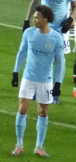 Im August 2016 wechselte Sané zu Manchester City in die Premier League. Er erhielt einen bis zum 30. Juni 2021 laufenden Vertrag. Obwohl beide Klubs Stillschweigen über die Ablösesumme vereinbart hatten,[16] schätzten deutsche Medien die Ablösesumme auf ca. 50 Millionen Euro und den Wechsel als den bis dahin teuersten Transfer eines deutschen Fußballspielers ein.[18][19] In seiner ersten Saison für Manchester City kam er unter dem Cheftrainer Pep Guardiola in 26 Ligaspielen (20-mal von Beginn) zum Einsatz und erzielte fünf Tore. In der Saison 2017/18 konnte Sané seine Leistungen weiter steigern. Er kam 32-mal (27-mal von Beginn) in der Premier League zum Einsatz, wobei er zehn Tore erzielte. Sané gewann mit City die englische Meisterschaft sowie den League Cup und wurde zum besten Nachwuchsspieler der Premier League gewählt.[20][21] Im August 2018 folgte der Gewinn des englischen Supercups. Auch in der Saison 2018/19 wurde Sané mit City englischer Meister sowie FA-Cup- und League-Cup-Sieger. Er kam dabei in 31 Ligaspielen zum Einsatz, in denen er erneut 10 Tore erzielte, aber nur noch 21-mal von Beginn auflief.