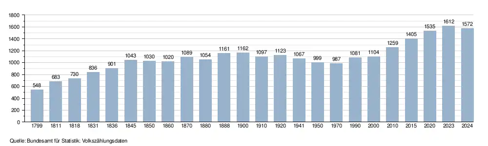 - ↑ Daten der Eidgenössischen Volkszählungen ab 1850 nach Gemeinden. (XLSX; 10 MB) Bundesamt für Statistik, Neuchâtel, 12. Juli 2024, abgerufen am 10. September 2025 (Öffnung in Excel nur über "Anhang/Excel-Datensatz" möglich).