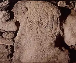 Vom Eingang an sind mehrere – zuvor geglättete – Tragsteine mit Gravuren bedeckt, die als Sonderform der so genannten 'Schildidole' (Scutiforme) möglicherweise Fruchtbarkeitsgöttinnen mit vielfachen 'Brüsten' darstellen. Die rippenartigen Formen anderer Steine betrachtete man dagegen zu einer Zeit, in der man allenthalben ägyptische Einflüsse zu erkennen glaubte, als Palmen oder Skarabäen. Es handelt sich hier jedoch möglicherweise um das, auch in anderen Knickdolmen im Morbihan variierte Thema der Muttergöttin. Sie kommt auch in Anlagen wie Dolmen von Keravel (ausgegangen), Rocher au Bono-Plouguemelen, Dolmen von Goërem in Gâvres oder im Galeriegrab von Luffang in Crach vor. Hier erinnert die Darstellung eher an einen mediterranen Kopffüßer.
