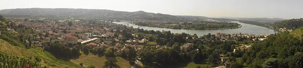 Blick auf Condrieu und Les Roches-de-Condrieu auf der gegenüberliegenden Rhôneseite | ||
