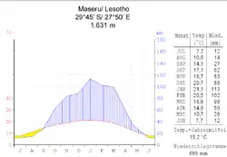 Durch die Lage auf der Südhalbkugel sind die Jahreszeiten in Lesotho denen auf der Nordhalbkugel entgegengesetzt. Das Klima ist durch die hohe Lage des gesamten Landes gemäßigt warm. Im Winter, zwischen Juni und August, wird es oft sehr kalt, und in den Höhenlagen im Osten kann Schnee fallen. Tagsüber ist es aber auch im Winter sonnig, während des gesamten Jahres hat das Land im Schnitt etwa 300 Sonnentage. In den Sommermonaten zwischen November und März ist es in Lesotho überwiegend heiß. An etwa 100 Tagen im Jahr, überwiegend im Sommer, gibt es Gewitter. Durch die Höhenlage können die Temperaturen während des Tages sehr stark schwanken (zwischen −15 °C nachts im Winter und bis über 30 °C während des Tages im Sommer). Die durchschnittliche Jahrestemperatur in der Hauptstadt Maseru beträgt 15 °C. In den Hochgebirgslagen der Drakensberge ist ganzjährig Schneefall möglich. Etwa 85 % der jährlichen Niederschläge – im Landesdurchschnitt etwa 600 bis 800 mm – fallen während des Sommers, weshalb die Landschaft in den trockenen Wintermonaten meist ausgedörrt ist.