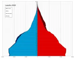 Lesotho hatte 2023 2,3 Millionen Einwohner.[9] Das jährliche Bevölkerungswachstum betrug + 1,1 %. Zum Bevölkerungswachstum trug ein Geburtenüberschuss (Geburtenziffer: 25,8 pro 1000 Einwohner[10] vs. Sterbeziffer: 14,1 pro 1000 Einwohner[11]) bei. Die Anzahl der Geburten pro Frau lag 2022 statistisch bei 3,0, die der Region Ost- und Süd-Afrika betrug 4,3.[12] Die Lebenserwartung der Einwohner Lesothos ab der Geburt lag 2022 bei 53 Jahren[13]. Der Median des Alters der Bevölkerung lag im Jahr 2021 bei 22,1 Jahren.[14] Im Jahr 2023 waren 33,8 Prozent der Bevölkerung unter 15 Jahre,[15] während der Anteil der über 64-Jährigen 4,2 Prozent der Bevölkerung betrug.[16]