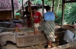 Die Dayak und andere Völker im ostmalaysischen Bundesstaat Sarawak bauen im Wanderfeldbau Bergreis an. Pflanzen, Dreschen und Einlagern von Reis ist überwiegend die Arbeit der Frauen, die auch wesentlich an den Ritualen rund um den Reisanbau beteiligt sind. Bei einem Langhaus (levu larun), das eine lange Reihe einzelner Wohnungen enthält, ist der lesung auf dem Terrassenvorplatz vor einer Wohnung aufgestellt.[45]