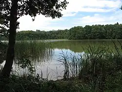 Das naturbelassene Gewässer ist vollständig von Wald umgeben. Die reich strukturierten Laubwälder des Naturparks Märkische Schweiz mit nach der Bundesartenschutzverordnung (BArtSchV) in Deutschland besonders geschützten Leberblümchen sowie Gelben Anemonen, Bachkraut, Wiesenprimel und Großblütigem Springkraut prägen Hainbuchen, Stiel- und Traubeneichen, Blutbuchen und Robinien. An den etwas feuchteren Standorten gedeihen Ulmen-, Ahorn- und Lindenarten sowie Rotbuchen. Eine besondere Rolle für die Ökologie spielen die reichen Totholzbestände.[12] Durch die Wälder streifen Rehe, Schwarzwild und Füchse sowie seit den 2000er-Jahren zunehmend auch Marderhunde und die Neozoen Waschbären und Minks.[13]