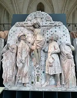 Besonders prächtig ist das Relief mit der Kreuzigungsszene gestaltet, das ursprünglich über dem Eingang zum Chor angebracht war. Der Hintergrund ist mit kleinen Quadraten verziert, die mit farbiger Glaspaste ausgelegt waren. Unter dem Kreuz stehen vier Personen, die Köpfe der beiden äußeren Figuren, vermutlich Maria und Johannes, sind nicht mehr erhalten. Zur Rechten des Gekreuzigten, steht die Figur, die Jesus mit einer Lanze in die Seite stößt, der Figur zu seiner Linken fehlt die Hand mit dem Essigschwamm, den sie Jesus reicht.