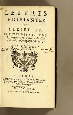 - Lettres édifiantes et curieuses des missions étrangères par quelques missionnaires de la Compagnie de Jésus, Paris, Nicolas Le Clerc et divers, 1702–1776, 34 vol.