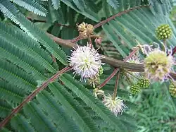 - Weißkopfmimose (Leucaena leucocephala (Lam.) de Wit): Sie kommt in drei Unterarten ursprünglich in Mexiko, im nördlichen Belize und im westlichen Guatemala vor. In Afrika, im tropischen Asien, in Australien und auf vielen Inseln im Pazifik ist sie ein Neophyt.[2]