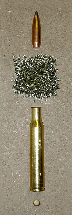 - Das Treibmittel, zum Beispiel Schießpulver oder Kordit.