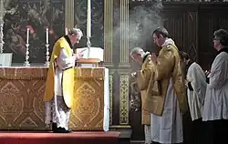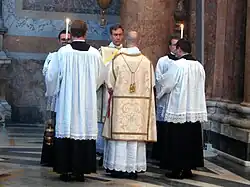 Waren kein Diakon und kein Subdiakon anwesend, konnten deren liturgische Rollen auch von Priestern übernommen werden, die Funktion des Subdiakons auch von einem Akolythen oder männlichen Laien.[6]
