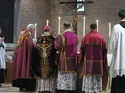 - Der Subdiakon trug die Epistel vor, der Diakon das Evangelium. Das Lektionar konnte dem Subdiakon von einem Akolythen geöffnet vorgehalten werden, dem Diakon vom Subdiakon, wenn das Buch nicht zum gelesenen oder gesungenen Vortrag auf einem Ambo abgelegt werden konnte. Epistel und Evangelium wurden von den Leviten contra altare, also mindestens schräg zum Altar hin und nicht direkt zum Volk hin vorgetragen – ein Hinweis auf den Charakter des Hochamts als Klerikerliturgie. Örtliche Gewohnheiten sahen jedoch auch einen Vortrag in dem Volk zugewandter Stellung vor.[10] An den Tagen, an denen die Planeta plicata getragen wurde, legten die Leviten diese zum Vortrag ab.