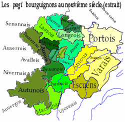 Die Landschaften (pagi) des mittelalterlichen Burgunds westlich (Herzogtum) und östlich (Grafschaft) der Saône.