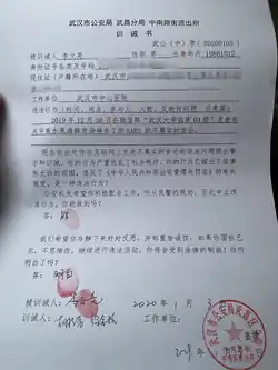 Am 1. Januar 2020 berichtete die staatliche Nachrichtenagentur Xinhua, dass acht Personen in Wuhan strafrechtlich belangt würden, weil sie Falschinformationen im Internet verbreitet hätten, was „negative soziale Folgen“ haben könne. In derselben Meldung wurde bekräftigt, dass es noch keine Anzeichen für eine Mensch-zu-Mensch-Übertragung der neuen Erkrankung oder eine Infektion des medizinischen Personals gebe.[11] In der Nacht nach seinem Online-Posting wurde Li in das Sicherheitsbüro der Stadt Wuhan einbestellt. Dort wurde er genötigt, eine Erklärung zu unterschreiben, in der er beschuldigt wurde, „unwahre Behauptungen gemacht“ zu haben, die die „gesellschaftliche Ordnung ernsthaft gestört“ hätten. Das Schreiben endete mit der Feststellung: „Wir wünschen, dass Sie sich beruhigen und sorgfältig nachdenken, und möchten Sie ernsthaft warnen: Wenn Sie weiter halsstarrig bleiben, Ihre Vergehen nicht bedauern und mit diesen illegalen Aktivitäten fortfahren, werden Sie strafrechtlich zur Rechenschaft gezogen werden – haben Sie das verstanden?“ Li unterschrieb mit „Ich habe verstanden“ (明白, míngbái – „verstanden“). Ende Januar veröffentlichte er eine Kopie des Schreibens auf der Internetplattform Weibo. Zu diesem Zeitpunkt hatten sich die Behörden öffentlich bei Li entschuldigt.[9][12]