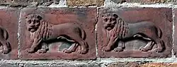 Das Gebäude hat sowohl auf der Nord- als auch auf der Südseite gotische Treppengiebel mit glasierten Formsteinen und Reliefziegeln, die besonders die Senkrechten betonen. Zudem befinden sich auf der Südseite profilierte, spitzbogige Blendnischen. Unter diesen verläuft über fast die gesamte Gebäudebreite ein Schmuckfries mit 17 von rechts nach links schreitenden Löwen, die sich dem Betrachter zuwenden. Ob es sich dabei um den Braunschweiger Löwen handelt bzw. was die Bedeutung dieses Frieses ist, ist unbekannt. Unterhalb des Frieses sind drei Wappen angebracht. Der Zweck dieser Wappenaufreihung ist, wie die der schreitenden Löwen, nicht eindeutig geklärt und Gegenstand vielfältiger Spekulationen, z. B. in Bezug auf den Pfaffenkrieg und Embers Rolle darin. Es scheint aber sicher zu sein, dass das linke Wappen jenes Herzog Bernhards I. (bzw. des Blasiusstiftes) ist. Das mittlere stellt den Braunschweiger Löwen dar und symbolisiert den Rat. Ganz rechts befindet sich jenes des Auftraggebers des Bauwerkes, Pfarrer Johann Ember,[20] dessen Name Zuber oder Eimer bedeutet und in dessen Wappen dementsprechend drei Eimer dargestellt sind.