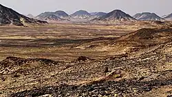 Die Libysche Wüste markiert in Nordafrika auf einem Quadrat von etwa 1000 mal 1000 km den östlichen Rand der Sahara, der größten Wüste Afrikas. Sie umfasst große Bereiche der Ostsahara und erstreckt sich vom Norden südlich des Vegetationsgürtels der Mittelmeerküste vom 30. Breitengrad bis in den nördlichen Sudan. Die dortige Grenze bildet in Höhe des 18. Breitengrades ungefähr der Unterlauf des südwest-nordöstlich verlaufenden, etwa 400 km langen Wadi Howar,[9] ein inzwischen ausgetrockneter, einst sehr langer linker Nebenfluss des Nil und heutiger Lebensraum der Kababish-Nomaden.[10] Im Osten wird die Libysche Wüste durch das Niltal begrenzt, obwohl geologisch gesehen die Ostgrenze der Libyschen Wüste eher mit dem Oasenbogen der Bahariya-Farafra-Dakhla-Kharga-Depressionen zusammenfällt, so dass man den 30. Längengrad als ungefähre Ostgrenze ansehen kann. Die östlich davon, vor allem aber östlich des Nils liegenden Höhenzüge und Wüstenteile bis zum Roten Meer, die plattentektonisch schon zur Faltungszone gehören, die sich im Randbereich von afrikanischer Platte und arabischer Platte bei deren Abbruch gebildet hat, die nun als Rift Valley bzw. Gregory-Spalte fast das gesamte östliche Afrika, das Rote Meer und Teile Palästinas durchzieht, heißen hingegen Eastern Desert (Östliche Wüste), im Sudan Nubische Wüste und gehören schon geologisch nicht mehr zu den Senken und Plateaus der Libyschen Wüste.