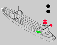 [30a] Ein Schiff vor Anker setzt zwei weiße Rundumlichter, eines nahe dem Bug und eines nahe dem Heck und unter dem vorderen Licht. Am Tag setzt das Schiff einen schwarzen Ball. Schiffe, die länger als 100 m sind, müssen zusätzlich Decklichter eingeschaltet haben. |