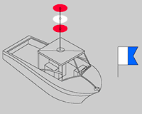 [27a] Zwei rote Lichter übereinander. Seitenlichter und Hecklicht (aber kein Topplicht) nur, wenn das Fahrzeug Fahrt durchs Wasser macht, also nicht treibt. Andere Schiffe müssen manövrierunfähigen Schiffen ausweichen. Am Tag führen manövrierunfähige Fahrzeuge zwei Bälle übereinander. Das Anzeigen von Manövrierunfähigkeit ist kein Notsignal. |