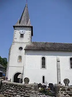 - Pfarrkirche in Athérey, gewidmet Quiricus und Julitta. Sie ist zweifellos nicht vor dem 17. Jahrhundert errichtet worden. Die Kirche besitzt einen viereckigen Glockenturm über dem Eingang und ein stark geneigtes Dach. Ein Gemälde im Inneren des Gotteshauses zeigt Julitta in roter Kleidung, wie sie ihrem Sohn Quiricus, der weiße Kleidung trägt, eine Hand reicht, der eine lange, schwarze Feder in seiner linken Hand hält.[14] Das Altarretabel aus Holz datiert aus dem 17. Jahrhundert und ist für eine baskische Kirche eher von bescheidener Größe. Es erstreckt sich auf zwei Ebenen, die durch einige Schlangensäulen strukturiert sind. Von mehreren vergoldeten Flügeln mit Voluten umrahmt, ist das Retabel mit Pflanzengirlanden und Heiligenfiguren als Flachrelief geschmückt und mit einem Tabernakel versehen. Zwei Engelstatuen an den Seiten komplettieren das Gesamtbild.[15] Auf dem angrenzenden Friedhof sind ebenfalls scheibenförmige Grabstelen zu sehen, von denen eine besonders alt ist. Sie stammt aus dem 15. Jahrhundert, während die meisten anderen aus dem 16. Jahrhundert datieren. Trotz des Alters sind die zuweilen rätselhaften Symbole auf den Stelen noch gut zu erkennen. Auf einer Stele lassen sich zwei Sonnen und mehrere Kreuze identifizieren. In der Mythologie und Ausdrucksweise vertreten diese Symbol die Idee des Lebens. Die Sonne wird als Quelle von Energie verehrt. Die Darstellung einer anderen Stele enthält ein Tier, das von einem Schwert durchbohrt zu sein scheint. Hilarri verraten zuweilen den Beruf des Verstorbenen, der in diesem Fall ein Jäger gewesen sein könnte.[16]