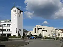 Der Turm der alten Kirche und rechts dahinter der Neubau der neuen Kirche. Neben den Turm schließt das Gemeinde- und Jugendzentrum an.