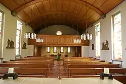 In der Kirche befindet sich der Besucher zunächst unter der Orgelempore, wo sich auch der Taufstein befindet. Diese Anordnung verweist auf die bis zum Zweiten Vatikanischen Konzil übliche Gestaltung eines Gotteshauses als Wegkirche, in der der Gläubige räumlich den inneren Weg zurücklegt, der durch die Taufe über die Teilnahme am Gottesdienst im Kirchenschiff bis zum Altarraum mit dem Allerheiligsten im Tabernakel gelangt. Der Altarraum hebt sich durch wenige Stufen vom restlichen Gottesdienstraum ab. Seit 1971 befindet sich im Altarraum ein schlichter Holzaltar, ein Ambo sowie an der Rückwand ein Holzkreuz sowie der Tabernakel, der von der vorherigen Innenausstattung übernommen wurde. Die getriebene Frontseite des Tabernakels zeigt neben dem Christusmonogramm die Worte „Der Meister ist da und ruft dich.“