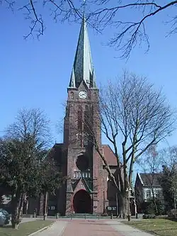 Die neugotische Stufenhalle mit Querhaus und Chor mit Fünfachtelschluss wurde von 1888 bis 1890 von Hermann Wielers in Backstein errichtet. Die Nebenchöre schließen flach. Die beiden westlichen Portalanbauten wurden 1898 angefügt. Der Turmhelm des Westturmes und der Dachreiter wurden nach der Zerstörung im Krieg erneuert. Der Bau ist durch Gruppenfenster und Strebepfeiler gegliedert. Am Turm und am Querhaus sind zusätzlich Blendfenster angebracht. Das Säulenportal im Westen, mit tiefem Gewände, ist von einem Wimperg bekrönt, darüber befindet sich ein Rosenfenster. Das Kreuzrippengewölbe im hellen Innenraum ruht auf Rundpfeilern; in die Vierung und den Chor sind Sterngewölbe eingezogen. Die ehemalige, teils figürliche Ausmalung, ist verloren gegangen. Die Kirche wird seit 2011 umfassend saniert.[1]