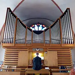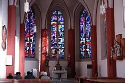 Das Kirchenschiff ist etwa 25 m lang und 8 m breit. Der Turm befindet sich an der Nordseite des Gebäudes auf Höhe des ersten Jochs von Osten. Im Turmbau befinden sich im Erdgeschoss die Sakristei und darüber der sich zum Kirchenraum öffnende Michaelischor. Im Ostchor befinden sich drei Buntglasfenster, die 1970 von Gottfried Zawatzki gestaltet wurden und das „himmlische Jerusalem“ zeigen[2].
