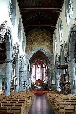 Der Grundriss ist kreuzförmig mit Kirchenschiff, Chor und Querschiffarmen, die durch schwere Spitzbögen auf massiven, im Grundriss rautenförmigen Stützen verbunden sind. Eine Voute mit Ziegelgewölbe ist mit Kreuzrippen aus Hartstein auf Kragsteinen mit dekorativer Bemalung versehen. Die niedrigeren Querschiffsarme sind mit Kreuzrippengewölben geschlossen. Der Chor ist mit erhaltenen polychromen Gemälden von Léon Bressers aus dem Jahr 1913 verziert, darunter im ersten Blindfeld mit Stammbäumen von Jesse und Adam. Die Seitenaltäre sind mit biblischen Szenen auf Leinwand bemalt (restauriert). Wandmalereien mit Medaillon und Verherrlichung der Heiligen Jungfrau mit musizierenden Engeln und Textbändern wurden im Jahr 1926 erneuert. Hohe Spitzbogenfenster sind mit drei erhaltenen neugotischen Glasmalereien aus dem Jahr 1899, entworfen von A. Verhaegen, gestaltet. Nichtfigürliche Glasmalereien wurden von Lionel Holvoet im Jahr 1975 geschaffen. Im Chor sind Kreuzrippengewölbe im geraden Joch und ein Gewölbe mit vier dekorativ bemalten Rippen, die strahlenförmig vom Gurtbogen und dem Schlussstein in der fünfseitigen Apsis ausgehen (bei der Restaurierung anstelle eines barocken Gewölbes erneuert), gestützt von Säulen mit bemalten Zierkapitellen. Der untere Teil ist mit Schriftband und polychromer Malerei gestaltet. Die Südostwand ist mit einer restaurierten Kredenz versehen.