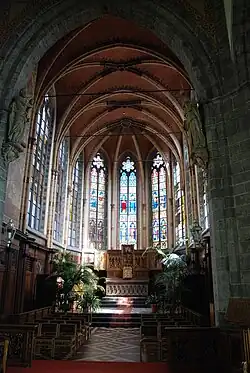 Der achtseitige Vierungsturm ruht auf einem quadratischen romanischen Unterbau; der Übergang vom Quadrat zum Achteck wird durch abgeschrägte Dreiecksdächer vermittelt. Das Glockengeschoss ist mit Spitzbogenfenstern geöffnet, die durch umlaufende Wasserschläge begrenzt werden und mit Säulen mit geschweiften Kapitellen sowie Mittelpfosten und vierteiligem Maßwerk gegliedert sind; ein profiliertes Gesims auf kleinen Konsolen; ein Zeltdach mit vier Zifferblättern schließt den Turm ab. Der schmale Chor schließt sich an den Turm an mit einem fensterlosen Joch und weiteren Jochen mit hohen Spitzbogenfenstern mit Maßwerk, die durch Strebepfeiler getrennt sind und mit Gesimsen eingefasst sind. Die Sakristei aus dem Jahr 1905 ist zwischen Chor und Südquerhaus angebaut, eine weitere Kapelle und ein Heizungsraum zwischen Chor und Nordquerhaus.