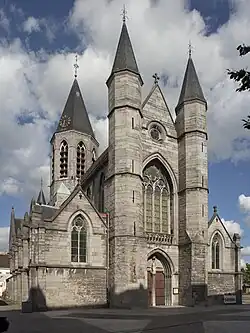 Die bemerkenswerte, vollständig restaurierte Westfassade mit hohem Giebel ist flankiert von zwei achteckigen Treppentürmen. Sie ist charakteristisch für die Scheldegotik, in vier Zonen und mit Schlitzfenstern gegliedert. Das zentrale Spitzbogenportal ist mit Rundstäben auf Säulen verziert und zeigt einen erneuerten horizontalen Türsturz sowie einen Trumeaupfeiler. In der Nische des Portals ist eine Steinstatue der Muttergottes von K. Verwilghen aus dem Jahr 1889 aufgestellt. Ein monumentales Spitzbogenfenster in Rundstab auf Säulen und Sohlbank mit Maßwerk akzentuiert die Fassade. Eine Brüstung ist zwischen den Türmen angeordnet, ein vertiefter oberer Okulus ist mit Vierpassmaßwerk versehen. Die flankierenden Treppentürme sind durch Kaffgesimse und ein abschließendes Gesims gegliedert. Die relativ breiten Seitenschiffe werden durch Gesimse und abgestufte Strebepfeiler gegliedert. Die Maßwerkfenster der Seitenschiffe sind mit tiefen Gewänden versehen. Die Nord- und Südfassade der Seitenschiffe sind mit jeweils fünf ähnlichen Giebeln versehen, die durch Strebepfeiler voneinander getrennt sind; die Südwand wurde bei der Restaurierung in Tournai-Stein neu errichtet. Auf der Nordseite liegt eine Tür im zweiten Joch; der bekrönende Türsturz ruht auf Konsolen mit erneuerten Köpfen, die Spitzbögen sind mit Säulen und geschwungenen Kapitellen versehen. Das Querschiff zeigt Spuren früherer romanischer Bauteile in Form von unregelmäßigen Steinblöcken im Norden und Süden. Die Westwand zeigt rekonstruierte Spuren einer breiten Arkade eines ehemaligen romanischen Chors, dessen Fundamente in der halbrunden Apsis beim Abriss eines Anbaus auf der Rückseite gefunden wurden. Die etwas niedrigeren Querhausarme werden von Giebeln mit Spitzbogenfenstern mit Maßwerk bekrönt.