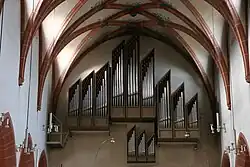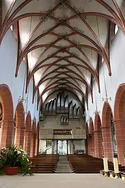 Die heutige Orgel der Kirche stammt aus dem Jahr 1972 und wurde von Wolfgang Scherpf, Speyer, erbaut. Das Pedalwerk befindet sich im Prospekt in drei Feldern in der Mitte, das Hauptwerk links, das Schwellwerk rechts. Das Positivwerk wurde unter dem Pedalwerk eingebaut. Das Instrument besitzt eine elektrische Spiel- und Registertraktur. Der Spieltisch ist freistehend und kann auf einem Podest bewegt werden. 2729 Pfeifen verteilen sich auf 35 Register samt Pedal.[14]