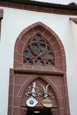 Am nördlichen Seitenschiff der Kirche befindet sich das Eingangsportal. Darüber ist ein Tympanon angebracht, in dem sich die Erbauer der Kirche verewigt haben: Zu sehen sind die Ebersteiner Rose mit der Mitra und das badische Wappenschild mit den Steinbockhörnern.[2]