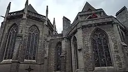 Der monumentale Westteil wurde auf der Höhe eines ehemaligen Burggrabens errichtet, der ab 1414 zugeschüttet wurde, mit Durchgang in den Strebepfeilern; er steht auf einer Brücke mit Gewölben auf der Grabenseite.