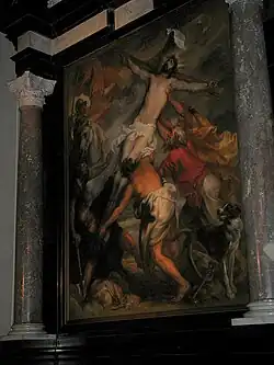Unter den Gemälden sind die Verkündigung des Erzengels Gabriel an Maria und die Heimsuchung Mariä bei ihrer Cousine Elisabeth, beide von Gaspar de Crayer (vor 1617) und die Kreuzerhöhung, die Anthonis van Dyck zugeschrieben wird, zu erwähnen. Das Chorgestühl von 1773 wurde nach einem Entwurf von F. Mangain (Tournai) ausgeführt von P.J. Van Réable (Kortrijk) (1775–1776). Vier Glasmalereien wurden nach dem Entwurf von J. Nicola (Roermond) und zwölf nach dem Entwurf von M. Martens (Brügge) ausgeführt. Ein bemaltes Grabmal aus der Mitte des XV. Jahrhunderts wurde im Chor ausgegraben. Die Orgel ist ein Werk der Firma Schyven & Cie., das im Jahr 1892 in das Gehäuse einer Orgel von Pieter Peteghem aus dem Jahr 1771 eingebaut wurde. Es hat heute nach einem Umbau im Jahr 1930 durch Jules Anneessens 23 Register auf zwei Manualen und Pedal.[2]