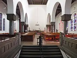 Der Hauptaltar ist ein Block aus rotbraunem Marmor, flankiert von sechs Kerzenständern. Kruzifix und Osterkerze vervollständigen das Ensemble. An den Seiten stehen zwei Ambos aus grauem Marmor. An der Rückwand der Apsis verläuft die Priesterbank. Einziger Schmuck der bildlosen Apsis ist eine siebenflammige emaillierte Lichterkrone von 1980 über dem Altar.