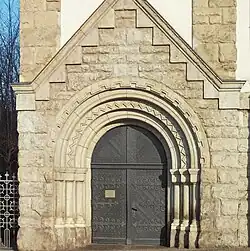 Am Südwestturm dient ein reich gegliedertes Rundbogenportal als Straßenzugang zur Kirche. Aus einer Vorhalle führt eine Treppe zum höher gelegenen Kirchenschiff. Sechs polierte Granitsäulen mit Kalksteinkapitellen tragen die Rundbögen, die die Seitenschiffe vom Hauptschiff trennen. Obwohl sich an der Ostseite das Pfarrhaus befindet, ist innen eine Rundapsis mit Rabitzkuppel ausgebildet.